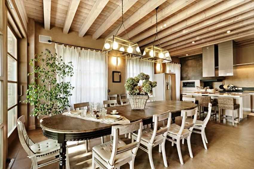 Гостей принято хорошо встречать, угощать вкусными блюдами собственного приготовления из красивой посуды. Поэтому центральное место на кухне занимает обеденная зона, разнообразная кухонная утварь, декор и посуда выставлены на обозрение. Приправы, пучки трав, связки чеснока и лука развешаны по кухне. Это не просто декоративные элементы, это обязательные ингредиенты вкуснейших блюд, которыми ежедневно пользуются.