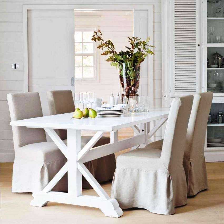 На фото кухонь в прованском стиле можно наблюдать открытые столешницы, но все же в большинстве случаев поверхность предпочитают закрывать красивой хлопковой, ситцевой или льняной скатертью, которая украшена цветочным принтом. При этом на стулья зачастую одевают чехлы, соответствующие стилю скатерти. Предпочтение отдают стульям с высокой спинкой и мягкими сиденьями.