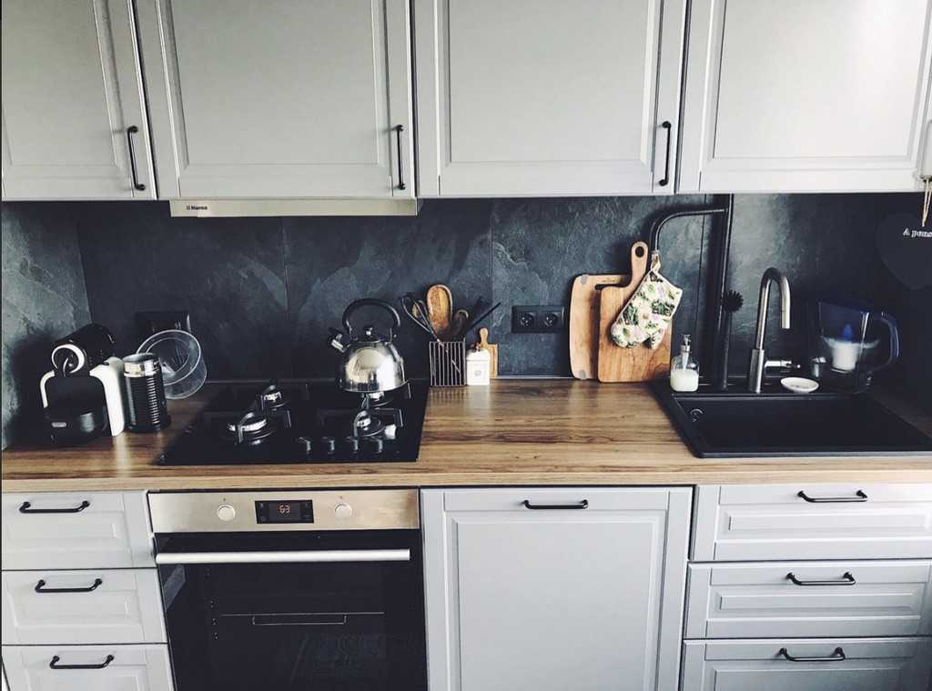 Еще один редкий прием, использованный в этой кухне — перекраска икеевских фасадов. Темно-серый цвет для них не родной. Также на типовой мебели заменили ручки.