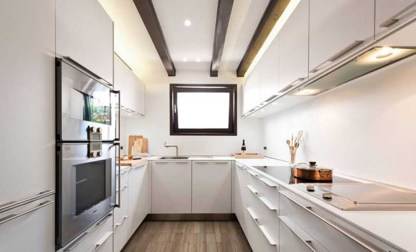 П-образная кухня устроена таким образом, что кухонные шкафы и техника размещены по двум противоположным стенам и находящейся между ними, таким образом гарнитуром заняты сразу два угла. Нередко средняя часть с рабочей зоной расположена под окном, такая организация пространства самая удачная. Одна из частей П-образной кухни – это часто полуостров или барная стойка. Обеденная зона, как правило, переносится в другое место или на полуостров. Шкафы покупаются неглубокие, учитывая размеры помещения.