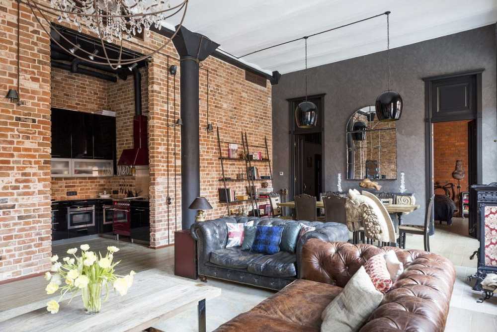 В основной комнате часть стены в зависимости от дизайна иногда отделывают искусственным камнем. Если площадь однокомнатной квартиры позволяет, каминную зону оформляют кирпичом. В иных случаях для облицовки используют бетон, краску и стеновые панели, а также рейки. Кроме того, можно отделывать стены штукатуркой, формируя разный эффект и рельеф.