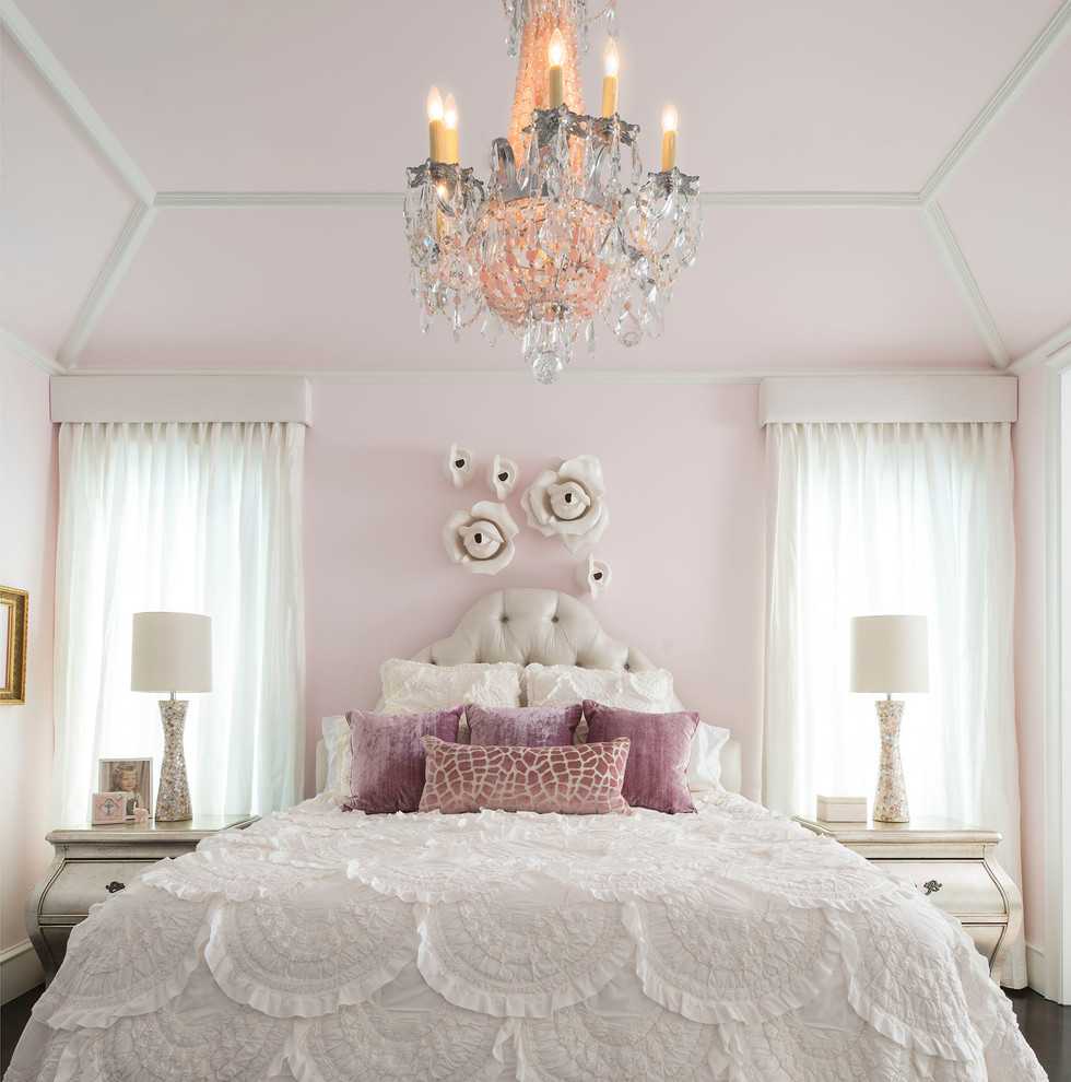 Пудрово-розовый цвет — простой способ создать спальню в романтическом стиле. Розу также можно найти в уютных аранжировках под знаком провансальского или гламурного стиля.