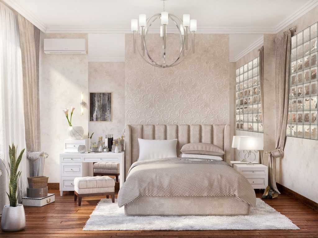 Бежевый цвет для спальни — универсальный и ненавязчивый. Он не слишком теплый, но и не холодный.