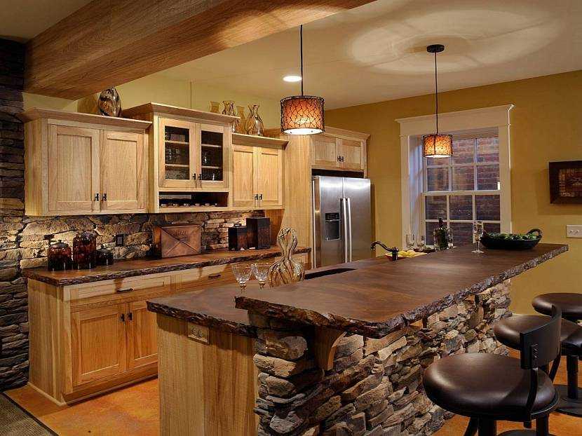 Барная стойка может быть с ящиками для хранения, откидной крышкой или пустой внутри. Последние два варианта подходят для малогабаритных угловых кухонь, так как экономят пространство.