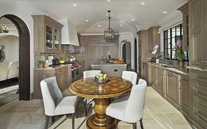 Классический стиль также имеет несколько направлений. Исконная классика отличается плавными симметрическими формами, резными ножками, овальной столешницей. Трудно представить эту мебель без белого цвета. Его сочетают с голубым, зеленым, а также с золотом. Но современный классический менее изысканный и более доступный. В любом случае классике нужен простор. Такую группу трудно разместить в обычной кухне, она создана для гостиной или студии.