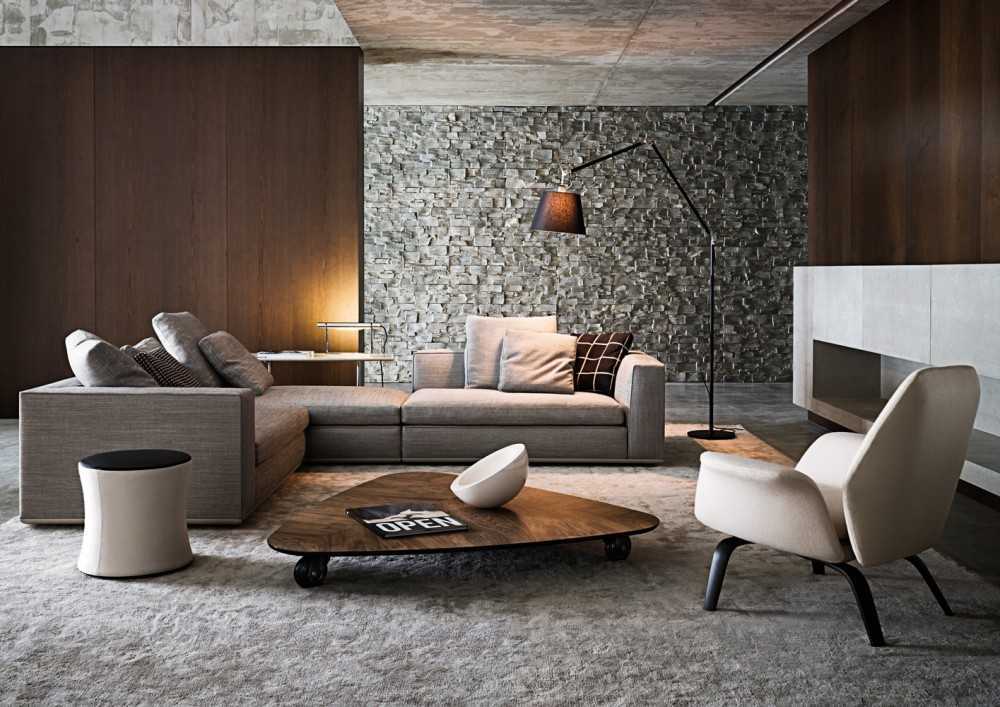 Если задача заключается в акцентировании внимания именно на мебели, ее оттенить от общей картины можно расположив на полу перед диваном коврик и установив возле него журнальный столик со светильником;