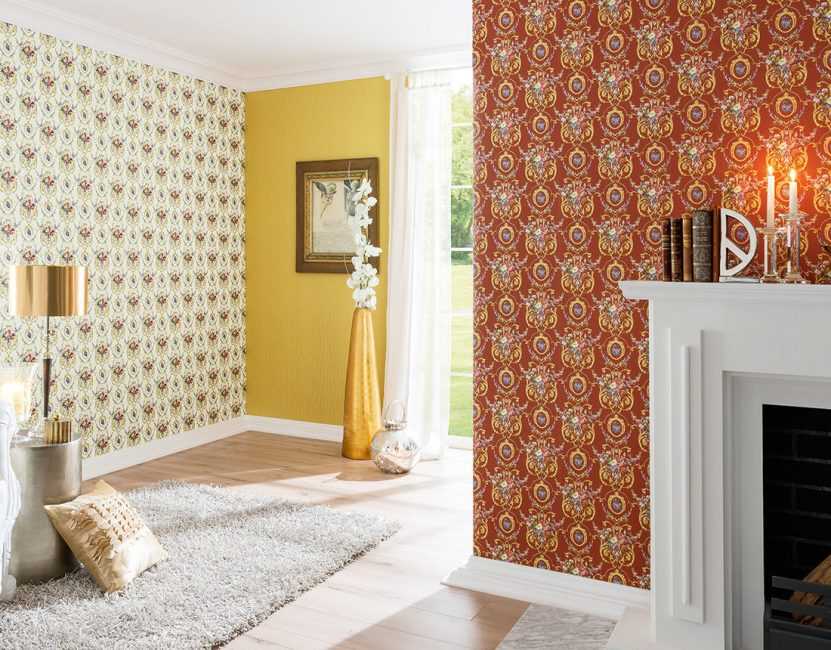 бледные рисунки на фактурных обоях; полосы; монохромные цвета — светлые, кремовые и бледные цвета; имитация декоративной штукатурки; витиеватые линии; орнаменты, стилизованные под дворцовую роспись.