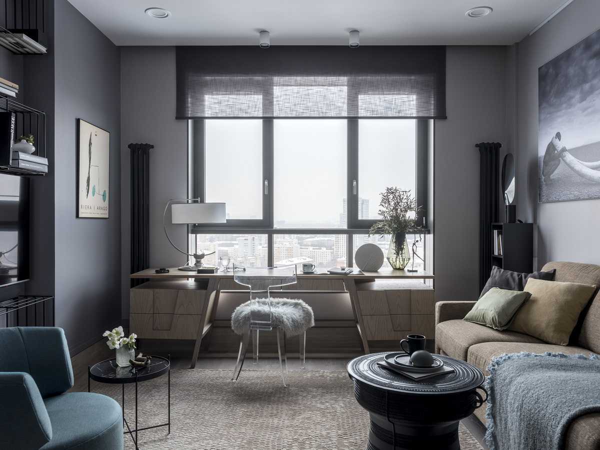Современный стиль любит противоположные цвета. Расцветки, такие как чернила, маренго или сапфир, соответствуют белому. В общем, серый или гранат будет хорошо смотреться. Стены могут оставаться полностью белыми, что еще больше осветляет интерьер.