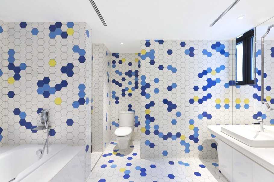 Соты — ячейки которые из воска создают пчелы в ульях, незаметно стали популярной формой, которую обыгрывают в оформлении комнат. Плитка (зачастую клинкер), имитирующая шестиугольники, используется в отделке ванной и кухонных фартуков. Обычно применяют фрагменты разных оттенков, для создания композиции с эффектом градации. Оригинально смотрятся варианты с переходом от стены к полу. К примеру, горизонтальная поверхность оформлена синим и белым кафелем, а вертикальная — черным, в которой встречаются «выпавшие» сверху куски. Также из сот создают повторяющиеся композиции и рисунки, но предпочтение отдают же хаотичному расположению шестиугольников.