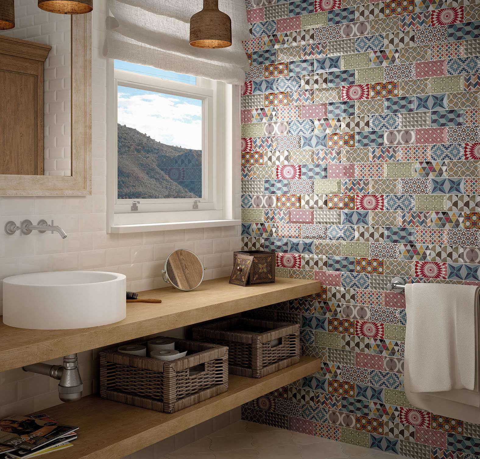 Пэчворк — метод сшивания крупных вещей (одеял, ковров, наволочек) из мелких лоскутков различных тканей. В раскладке плитки этот прием встречается довольно часто. Однако из-за излишней пестроты не рекомендуется оформлять подобным способом всю стену или пол. Чтобы в интерьер такая отделка влилась органично, ее применяют на отдельном участке поверхности, который и будет акцентным элементом в помещении. Комбинируют кусочки разных цветов, размеров и рисунков. В некоторых вариантах «стыки» оформлены с имитацией швов из ниток.