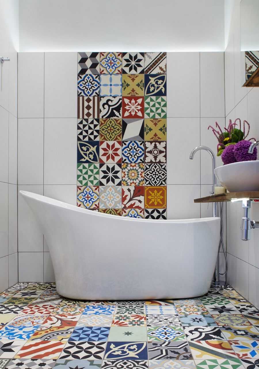 Из плиток небольших размеров выкладывают «пиксельные» композиции или сложные орнаменты, которые «протягивают» через отдельные зоны. Схожей техникой считается «калейдоскоп», то есть сочетание разных рисунков и цветов на фрагментах. Орнаментом не советуют оформлять маленькие ванные комнаты. Эффектнее он смотрится в качестве приема зонирования в совмещенных помещениях.