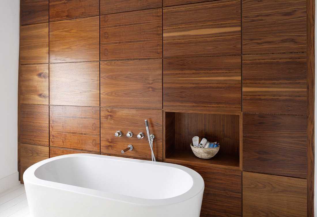 Чтобы не резать его вдоль и поперек визуальными швами плитки, лучше микшировать ее со стеновыми панелями или сайдингом для внутренней отделки. Это упростит работу по облицовке и избавит интерьер ванной от дробления плиточными швами.