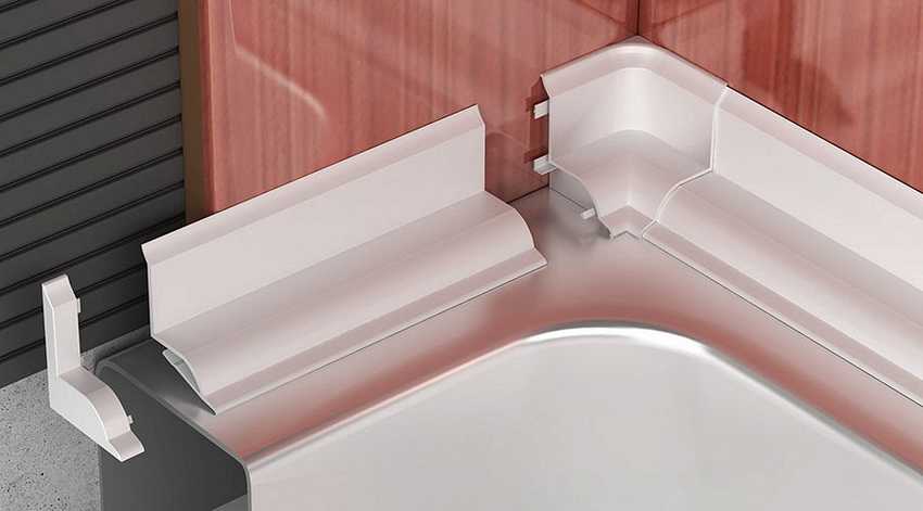 Далее – плинтус для ванны двухсоставной. По своей сути, он такой же, как пластиковый молдинг для столешниц: сначала устанавливается монтажная рейка, на которую затем крепится внешняя часть. Минусы этот багет имеет те же самые, что описаны выше, для односоставных профилей.