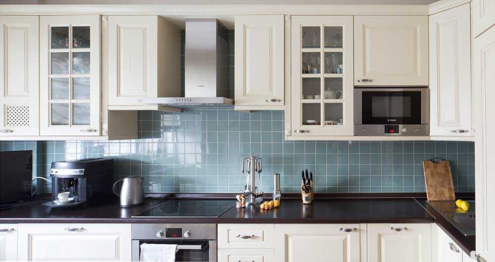 4. В месте, где установлена кухонная плитка к 60 см основной ширины фартука необходимо добавить 60 -80 см в высоту, и на 10 -15 см сделать ее шире, чем кухонная плита. Как правило, плитку укладывают до кухонной вытяжки