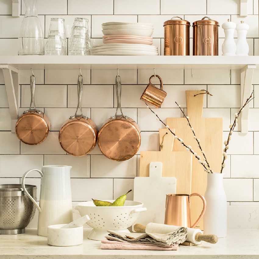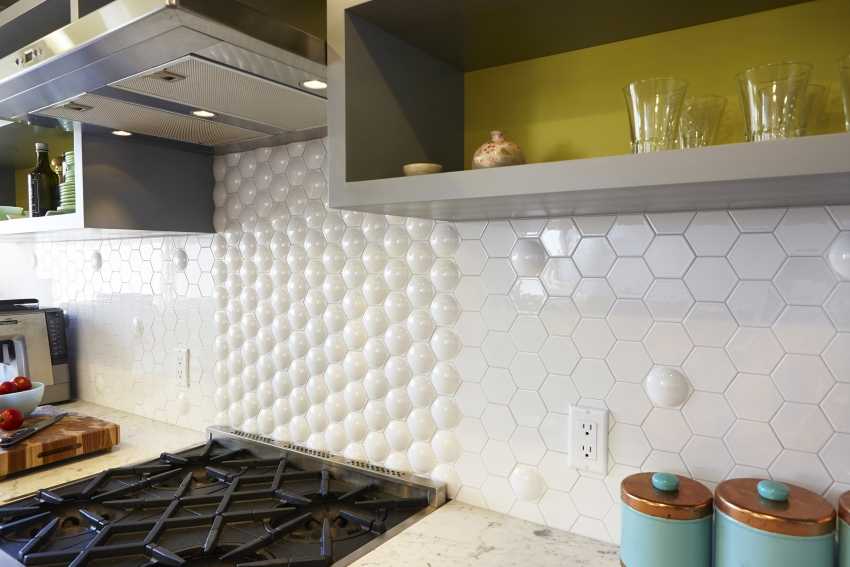 Разнообразить однотонную плитку на фартуке можно, используя объемные элементы