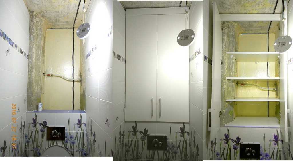 Для устройства придется вынести унитаз вперед, к стенам и на потолке прибить планки (40*40 мм вполне нормально будет), набить горизонтальные планки, которые будут удерживать полки. Дверки для такого шкафа в туалет крепятся непосредственно к стенам. Вернее, к планкам, которые закреплены на стене.