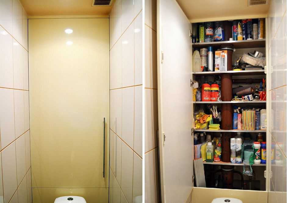 За этой фальшстеной спрячутся канализационные и водопроводные стояки, которые иначе придется закрывать специальным коробом. Пространство за унитазом необязательно зашивать наглухо. Тут можно сделать очень вместительный шкаф. В нем могут храниться порошки, запасы другой химии, которым обычно тяжело найти место.