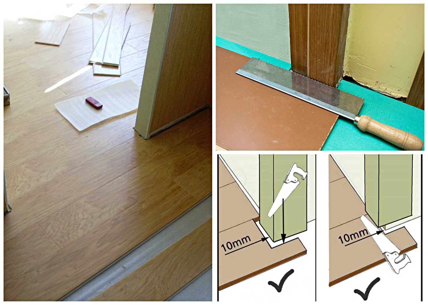 В случае с дверями ситуация иная. Необходимо сделать так, чтобы ламинированный элемент прикладывался к дверной коробке заподлицо. Лучше, если в лудке будет вырез, в который войдет ламинат, что полностью скроет щель.