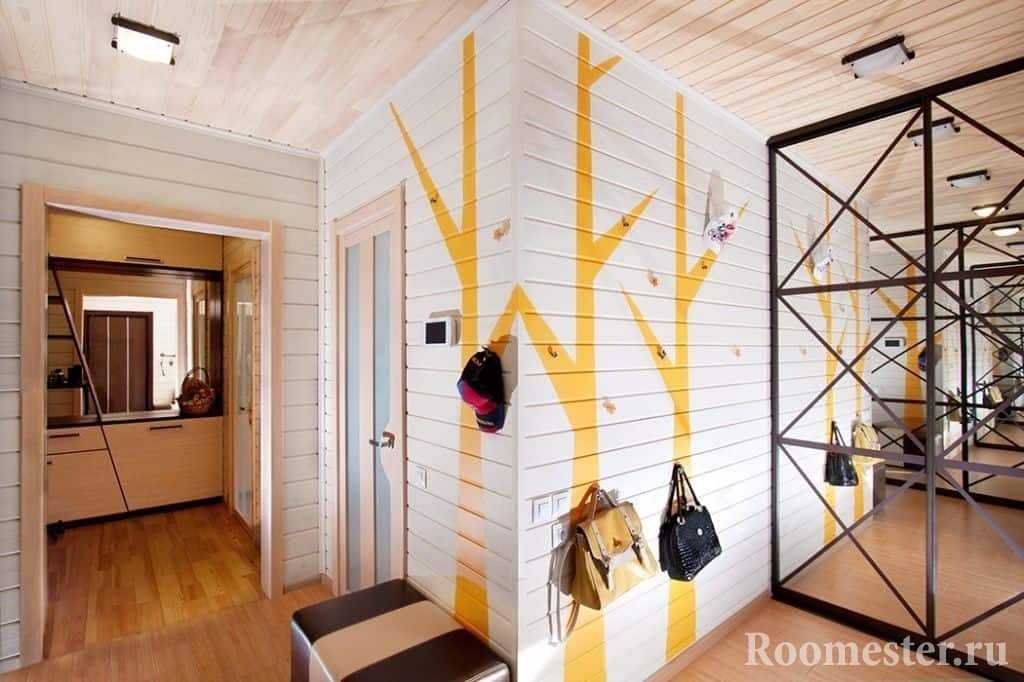 - Отделка стен прихожей зависит от того материала, из которого сложен загородный дом. Если он собран из цельных бревен, то закрывать чем-либо подобную естественную красоту – кощунство и преступление, дизайн прихожей лучше выполнить в соответствующем стиле, дополнительно облагородив структуру дерева защитными лессирующими средствами. Когда при возведении внешних стен использованы кирпич, блоки, каркасные технологии, прихожую можно оштукатурить, окрасить, оклеить обоями, оформить деревянными панелями. Но, прежде всего, отделочные материалы должны быть практичными. Деревянные панели, выкрашенные под основной цвет стен или на контрасте – вариант, подходящий семье, где есть дети. Прикрепив к поверхности детские рисунки, легко устроить настоящую выставку, у приходящих гостей появится прекрасный повод завязать приятный разговор.