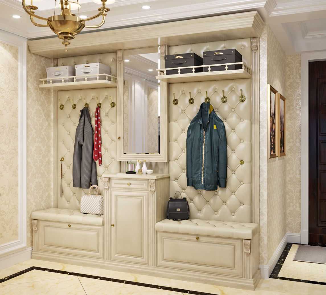 Одним из самых распространенных стилей интерьеров является классика. Ей свойственны натуральное дерево, декоративная ковка, зеркало в резной раме, изысканные аксессуары. Мебель в прихожей в квартире должна быть симметричной, строгих геометрических форм, светлых оттенков, приближенных к натуральным. Наряду с платяным шкафом с глухими, распашными дверцами, можно использовать резную деревянную вешалку, трюмо, мягкий пуф с обивкой из шелка, сатина, жаккарда.