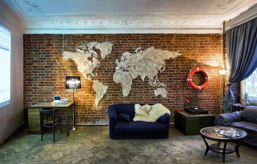 - Отделка стен, соответствующая стилистике, достигается несколькими способами. Обычная штукатурка – простой вариант, требующий минимальных затрат времени, сил и финансов. Придать отштукатуренной поверхности интересный вид помогут авангардистские картины, коллажи, старые афиши. Более интересный способ – кладка натурального камня или кирпича. За счет этого достигается настоящий индустриальный дух заводов XX века. Чтобы сэкономить на натуральных материалах, можно остановить выбор на декоративных накладках, имитирующих кирпичный рельеф.