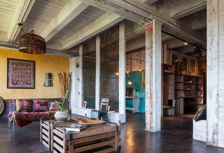 В интерьере должна присутствовать аура промышленного прошлого, что достигается следующими средствами: