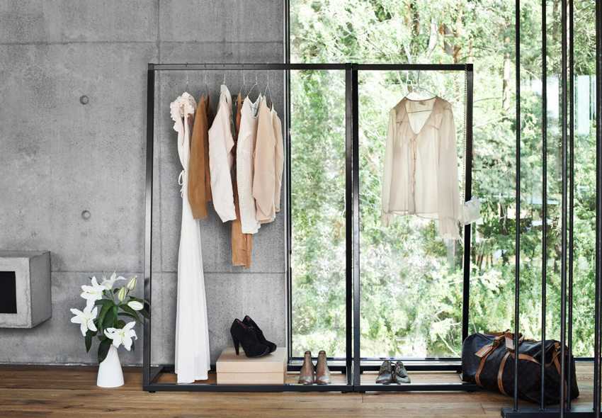 На открытой вешалкев в стиле лофт можно хранить верхнюю одежду, и при этом она не занимает много пространства