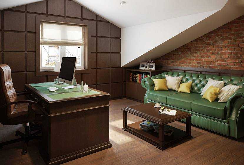 Дизайн маленького кабинета руководителя будет выглядеть более уютным и стильным, если лофтовую отделку стен (кирпич и бетон) смягчить использованием классической ретро мебели.