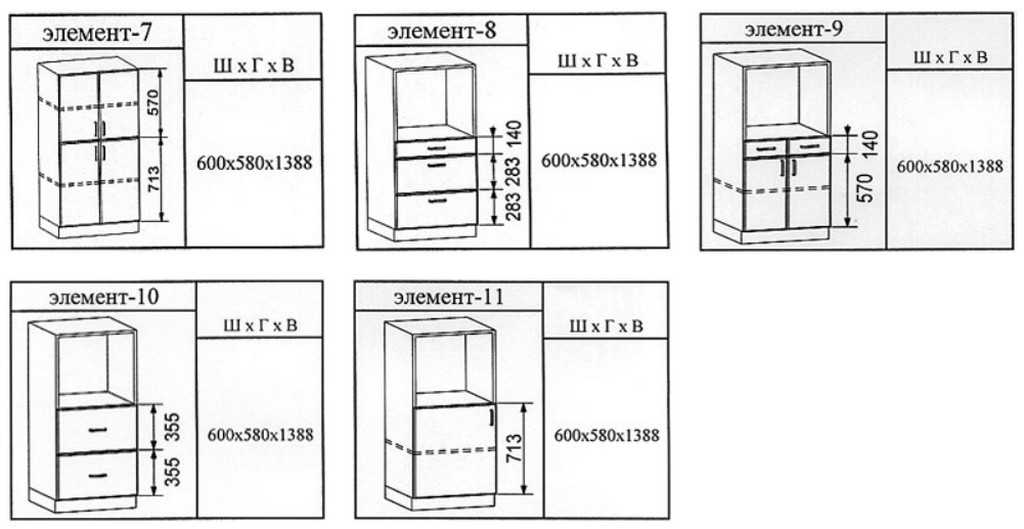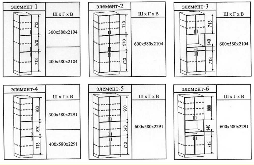 Стандартные размеры пеналов, тумб и шкафов прямой планировки