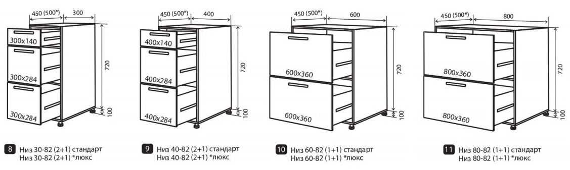 Общие габариты модуля с выдвижными ящиками мы уже описали выше под заголовком «Нижний ярус». Теперь подробнее поговорим о их высоте и количестве, так как данные параметры имеют принципиальное значение в плане удобства.