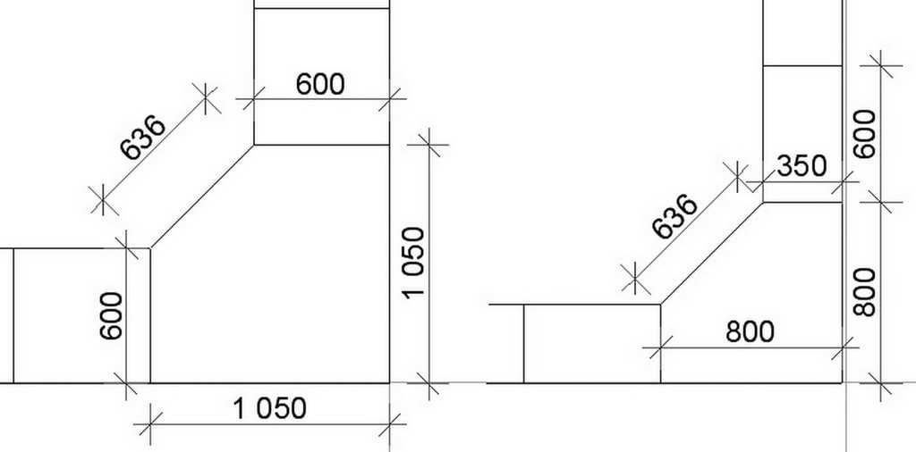 Угловые навесные и напольные модули могут иметь различную конфигурацию. Стандарты для угловых тумб с прямым и скошенным углом приведены на схемах ниже.