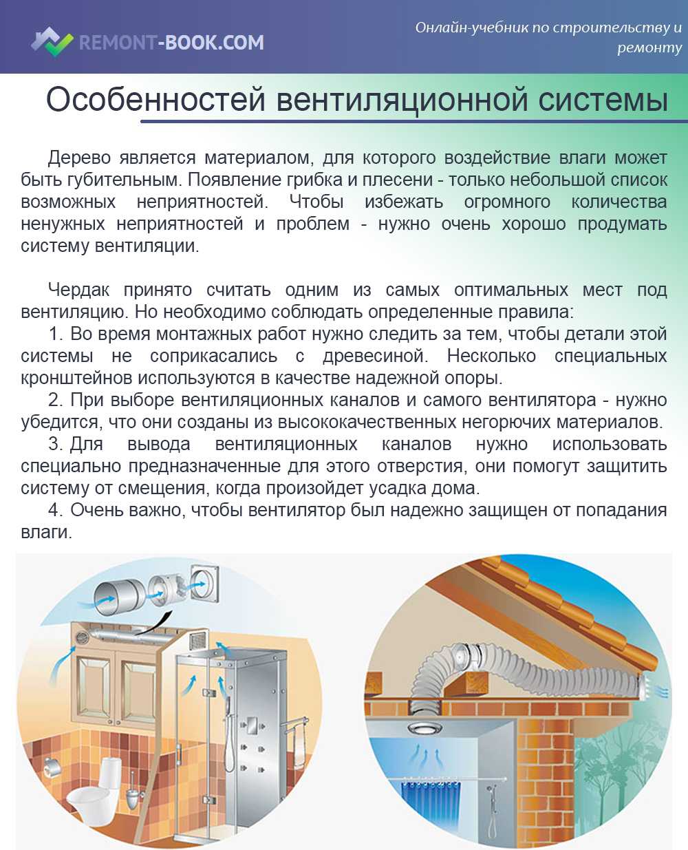 После полной установки канализационных каналов полностью обустраивается вентиляция. В деревянных строениях она необходима для устранения влажных испарений из помещения. При обустройстве помещения в деревянной конструкции требуется прокладывать полноценные вентиляционные каналы с выходом на чердачное помещение.