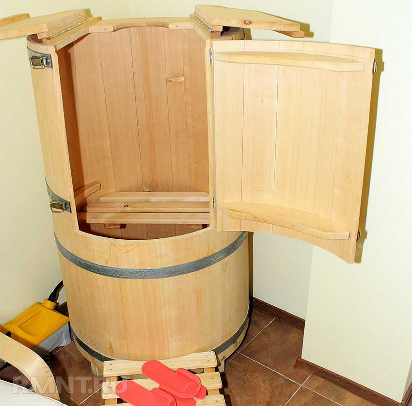 Фитобочка часто выполняется из можжевельника или древесины хвойных пород, обработанной специальным образом. Эта парилка компактна и мобильна, рассчитана она на одного человека, для нее найдется место даже в самой небольшой квартире. Выглядит она как деревянный бочонок, человек сидит внутри на скамеечке, а голова находится снаружи. Работает такая бочка от сети, много электроэнергии не потребляет, при необходимости легко переносится на другое место либо разбирается и прячется в кладовку. По своим целебным свойствам она не уступает другим моделям парилок. В комплект входят пульт управления и термометр для контроля нагрева.