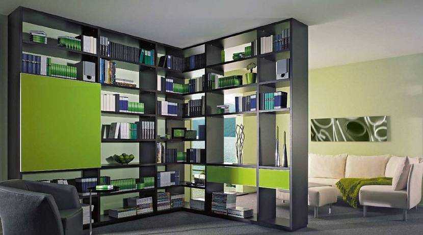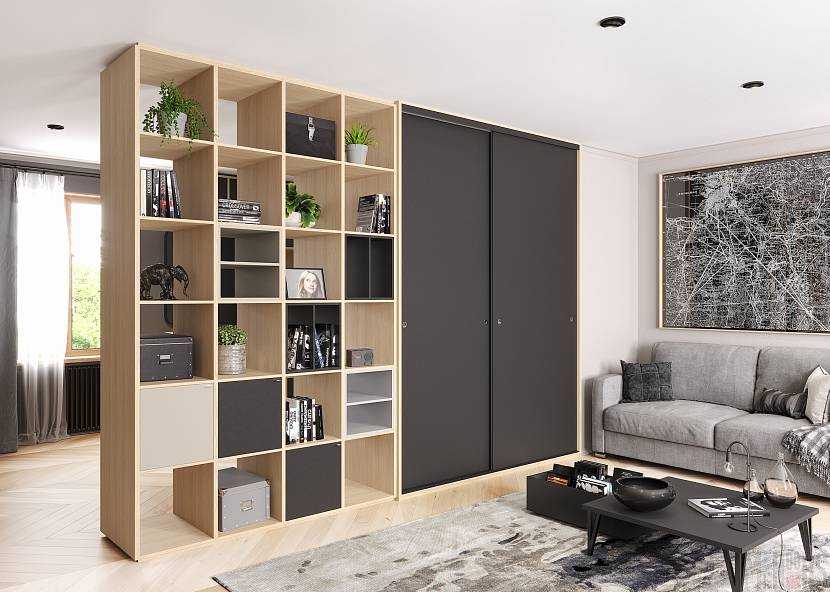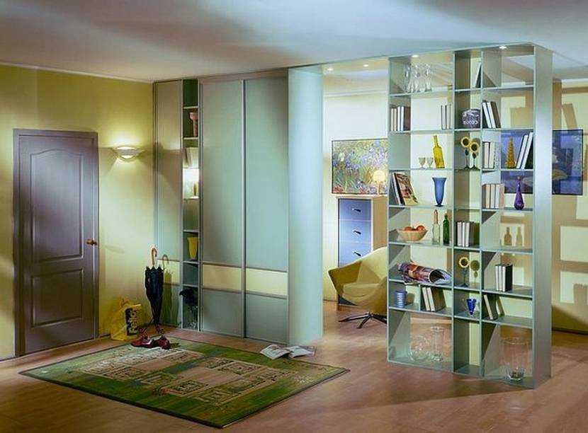 Возможно комбинирование разнообразных перегородок, например, совмещение шкафа-купе и стеллажа для книг.