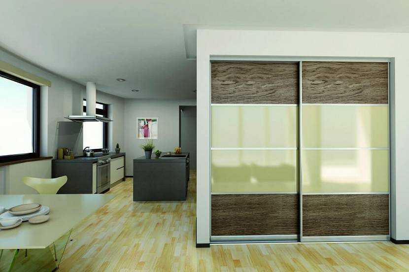 Удобный и компактный шкаф-купе поможет разделить помещение любой, даже самой минимальной площади. Такой вид перегородок делают на заказ под индивидуальные размеры помещения и пожелания клиента. Дверцы шкафа могут быть выполнены из зеркала, благодаря чему в помещении появляется больше света и визуально расширяется пространство.