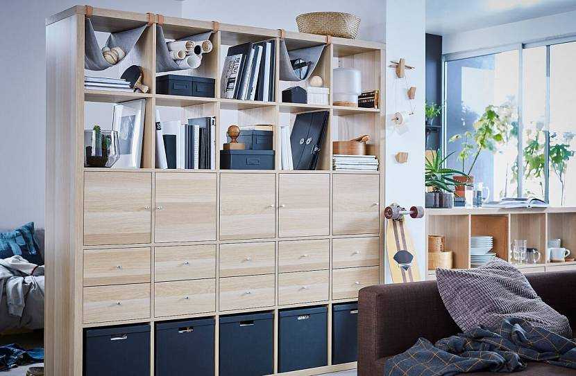 Для разделения комнаты на зоны можно установить более легкую конструкцию — стеллаж. Такой вид перегородок не утяжеляет интерьер, обеспечивает беспрепятственное поступление солнечного света. Заполнить стеллажи можно книгами, растениями, декоративными элементами.
