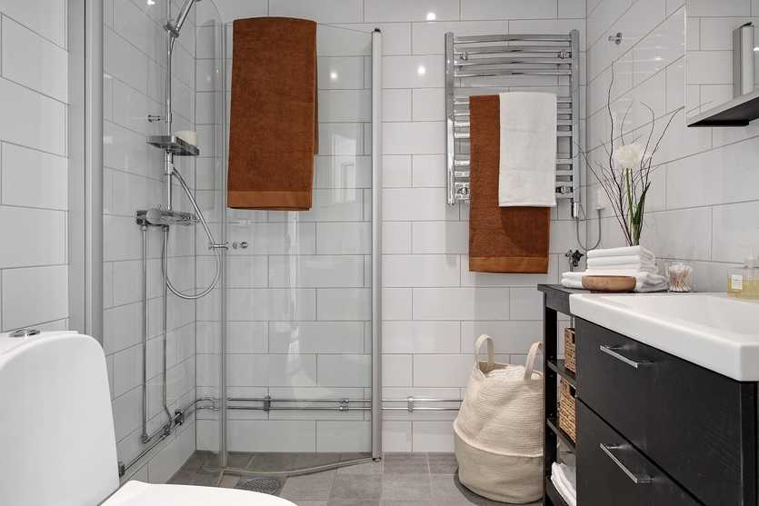 Что до цвета стен в ванной в скандинавском стиле, то и здесь актуальна светлая естественная палитра. А добавить акцентов помогут декоративные материалы: плетеные корзины, лён, сухоцветы.
