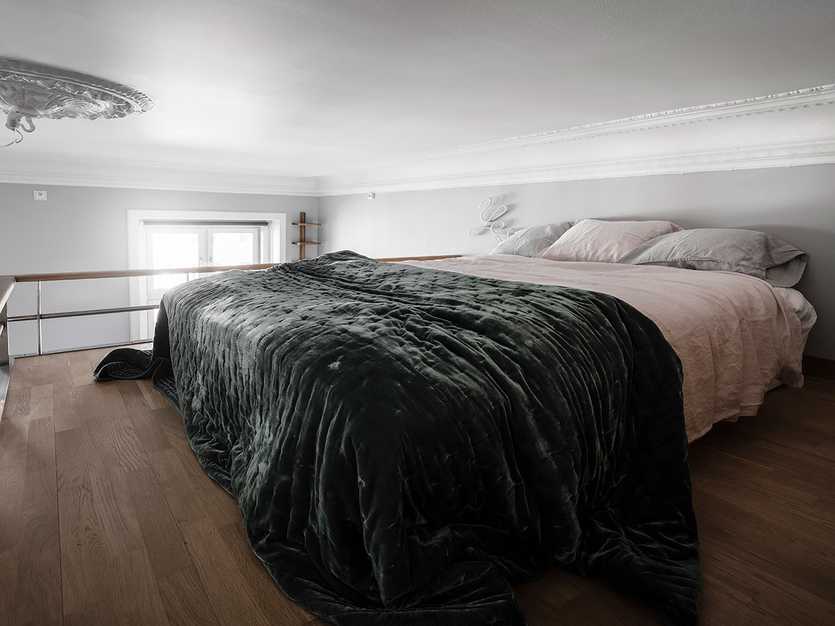 Еще одна маленькая сканди-квартира, в которой высокие потолки позволили выделить место для спальной зоны. На 26 кв. м полноценную спальню удалось обустроить, задействовав пространство над санузлом.