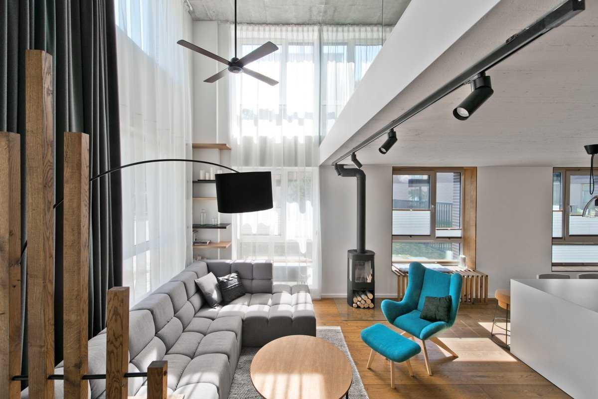 Сочетание белого и серого цветов всегда смотрится выгодно, особенно, если речь идет о скандинавском стиле. Гостиная с мягкой мебелью просторная и светлая.
