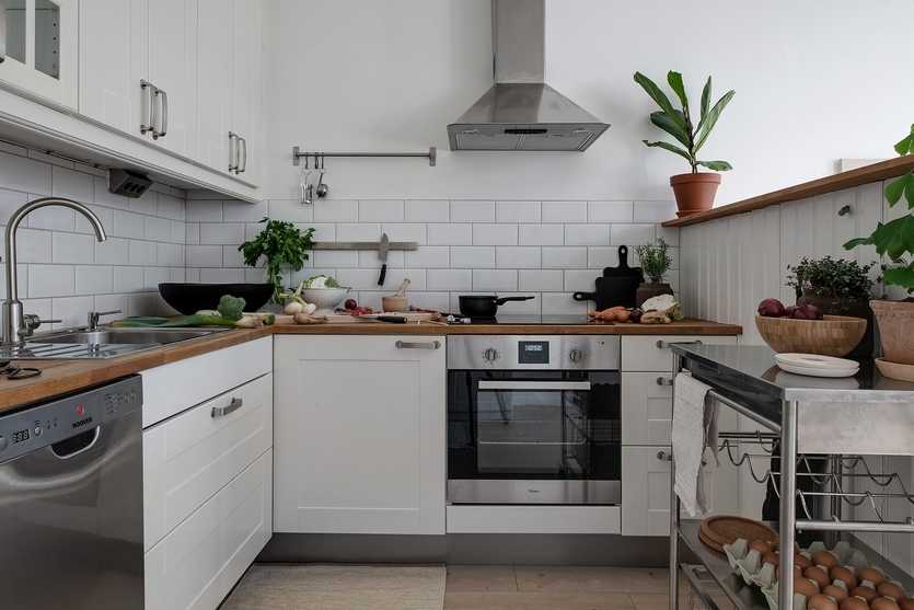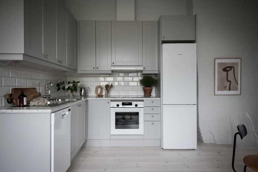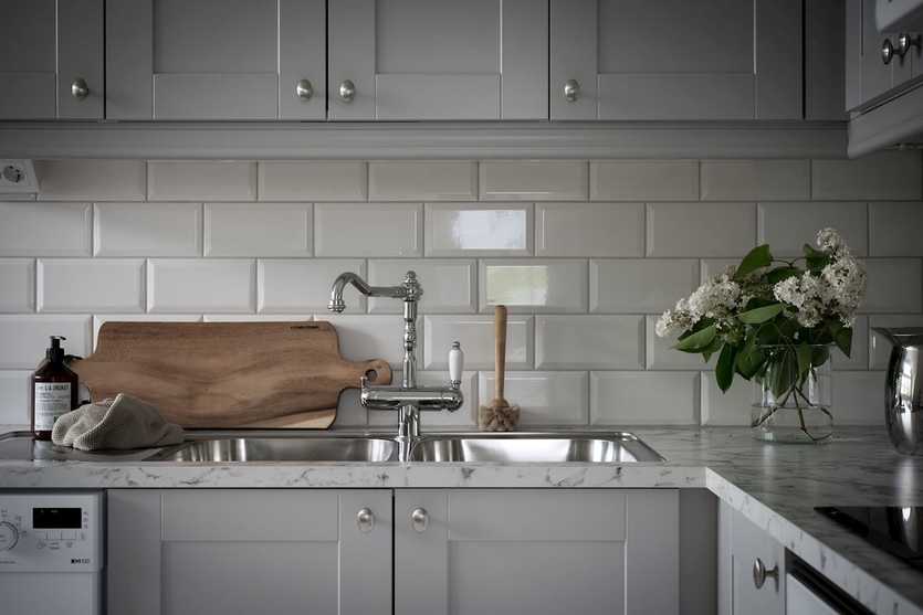 Главное в гарнитуре — лаконичность и простота. Белый, бежевый, пепельный серый или голубой — самые популярные цвета. Столешница может быть выполнена из искусственного или натурального камня, дерева, а фартук — из плитки.