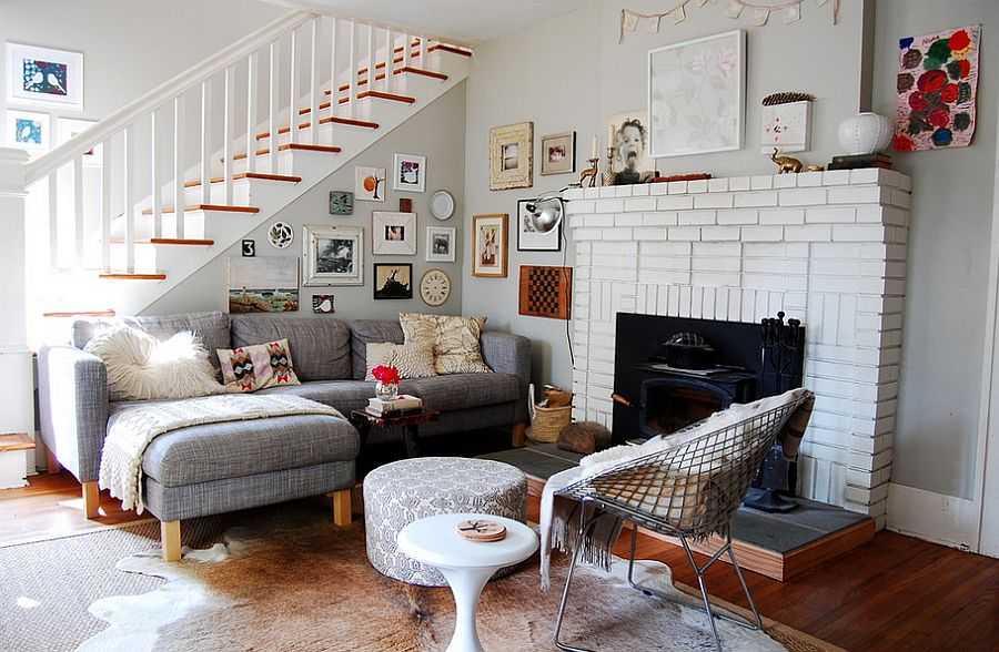 Главные компоненты зала — камин или биокамин, мягкий диван, журнальный столик. Но не стоит забывать и про функциональное назначение комнаты: организуйте удобное хранение с помощью стеллажей, шкафов, плетеных коробок и корзин. Можно задействовать подоконник, разместив на нем несколько удобных подушек.