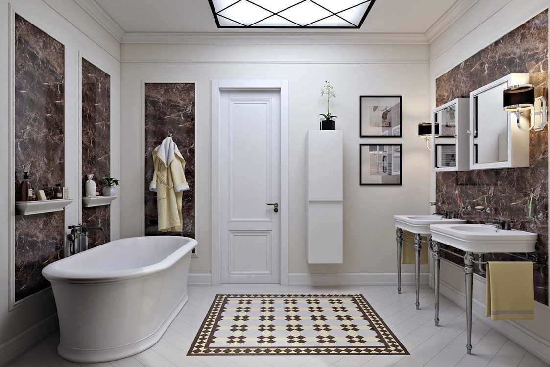 Санузел в классическом стиле – настоящий рай для перфекциониста! Впрочем, классика, как известно, вечна. Поэтому такое решение также можно назвать универсальным.