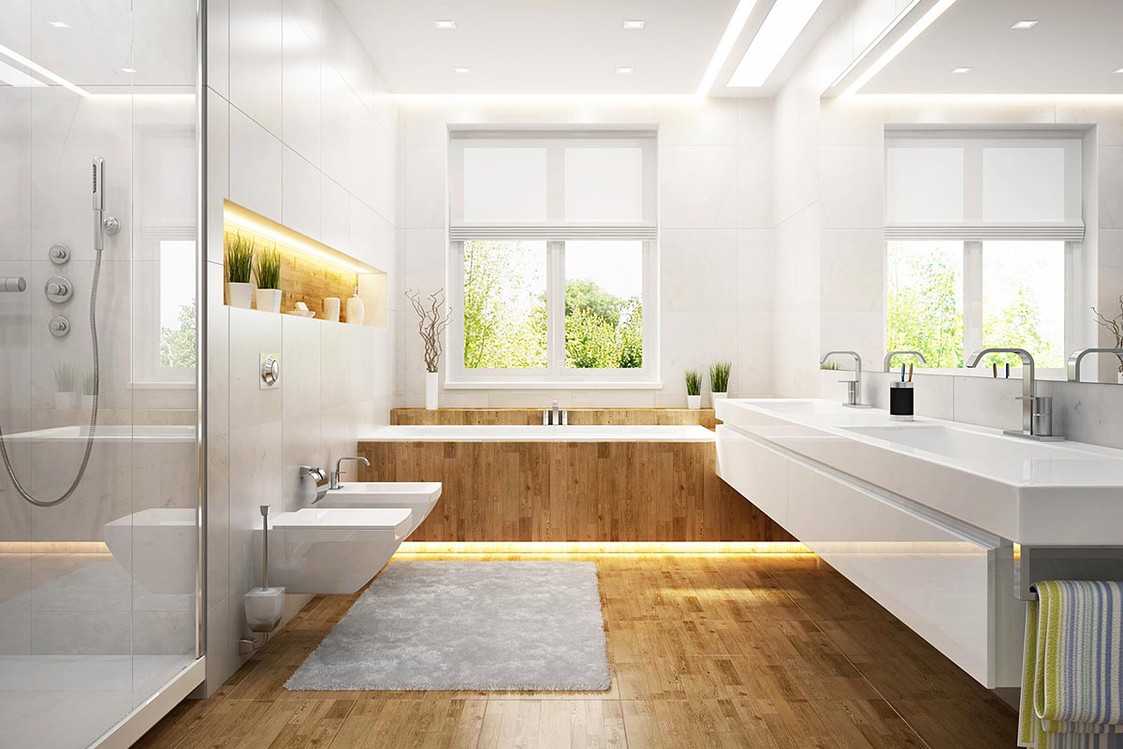 Для интерьеров в стиле минимализм лучше всего подойдет сантехника с прямыми линиями. Причем лучше остановить свой выбор на предметах в белом цвете. Особенной эффектности придадут подвесные унитазы и прозрачные душевые кабинки. На пол можно положить ламинат.