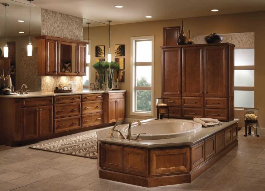 Для ретро-стиля характерна массивная деревянная мебель, которая может иметь даже потертую поверхность, обилие керамических и металлических аксессуаров, бронзовые и медные краны и смесители, ванны на изогнутых стальных ножках и т.д.