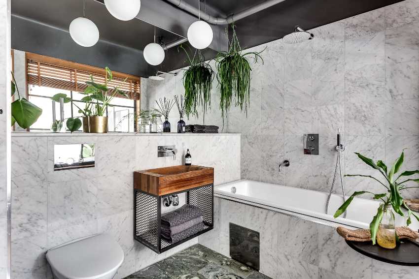 Главные приметы этого стиля – обилие натуральных материалов, например, камня и дерева. Если пространство санузла позволяет, то рекомендуется украсить его живыми растениями и цветами.