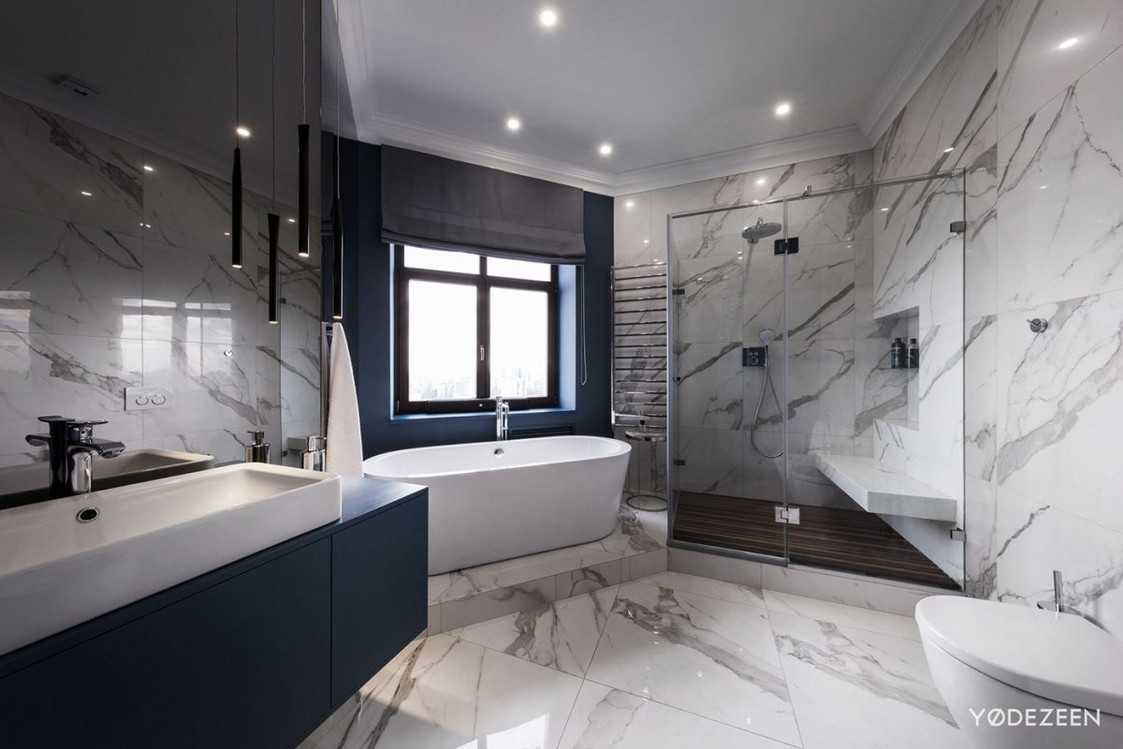 Следующим по популярности идет синий и голубой цвет в отделке ванной комнаты. Он символизирует чистое небо или водную гладь. Способствует психическому равновесию, успокоению, релаксации. Модным вкраплением на фоне синего цвета станут сочные оттенки желтого либо оранжевого.