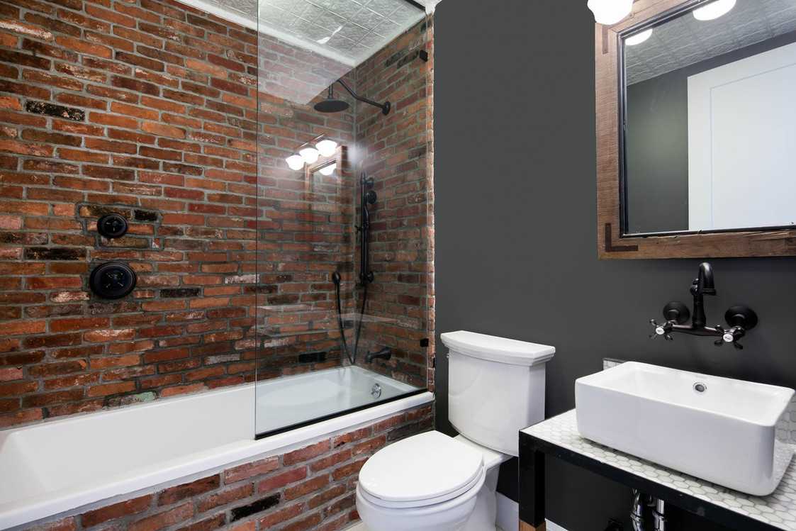 Чем креативнее материал, тем умереннее его использование. Например, при выделении стены фактурой под кирпич приходится отказаться от массы аксессуаров. Обычно такой дизайн подразумевает минимальный вариант украшательства ванной. Другие стены придется сглаживать, например, однотонными покрытиями вовсе без рисунка.