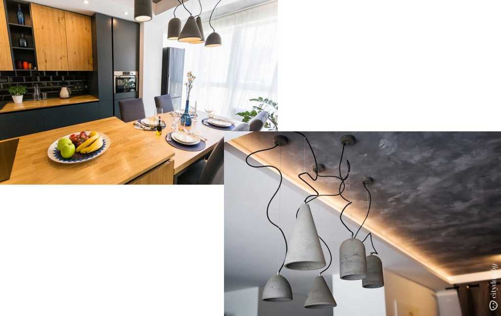Над обеденным столом можно повесить большую люстру, не обойтись в маленьком помещении и без точечных светильников, установленных над рабочей поверхностью.