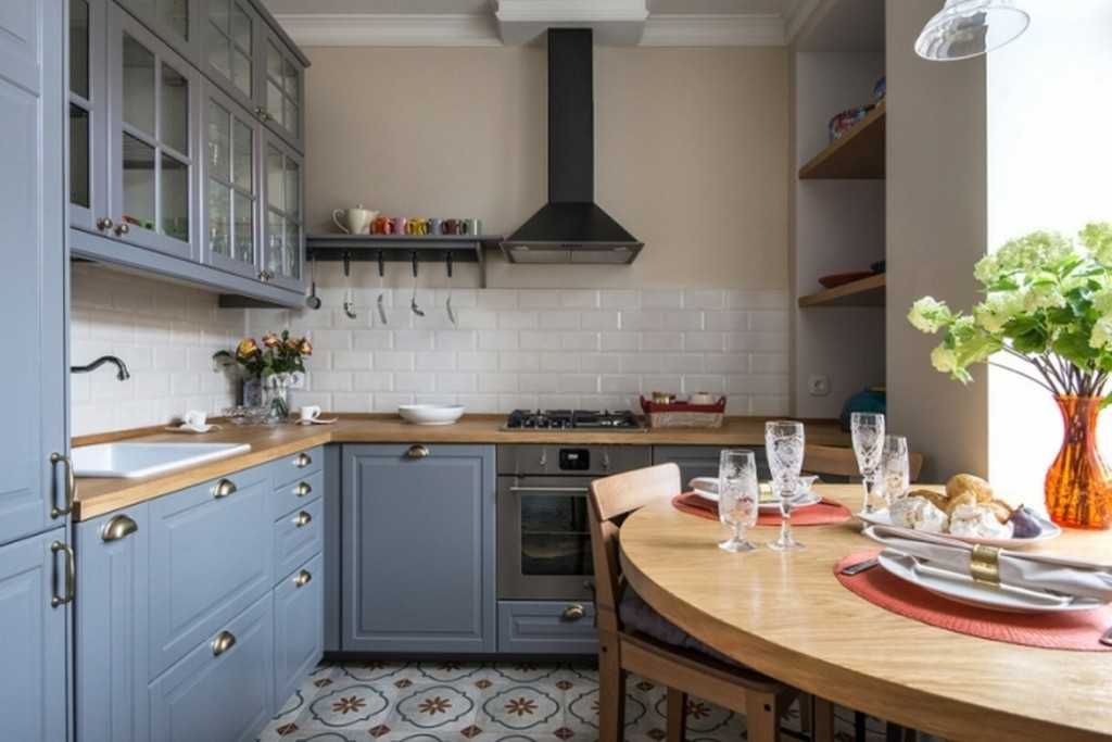 Вместо стандартных 60 см, можно заказать шкафы глубиной 35 см. При угловой планировке такое решение можно реализовать, установив узкие шкафы только на одной из сторон. Это некритично скажется на хранении.