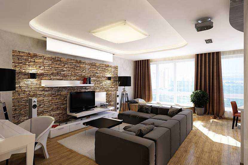 Для украшения комнаты следует использовать натуральные оттенки и материалы в виде камня либо дерева. Такой акцент соединяет гостиную с расположенной поблизости природой. В комнате будет органично смотреться: